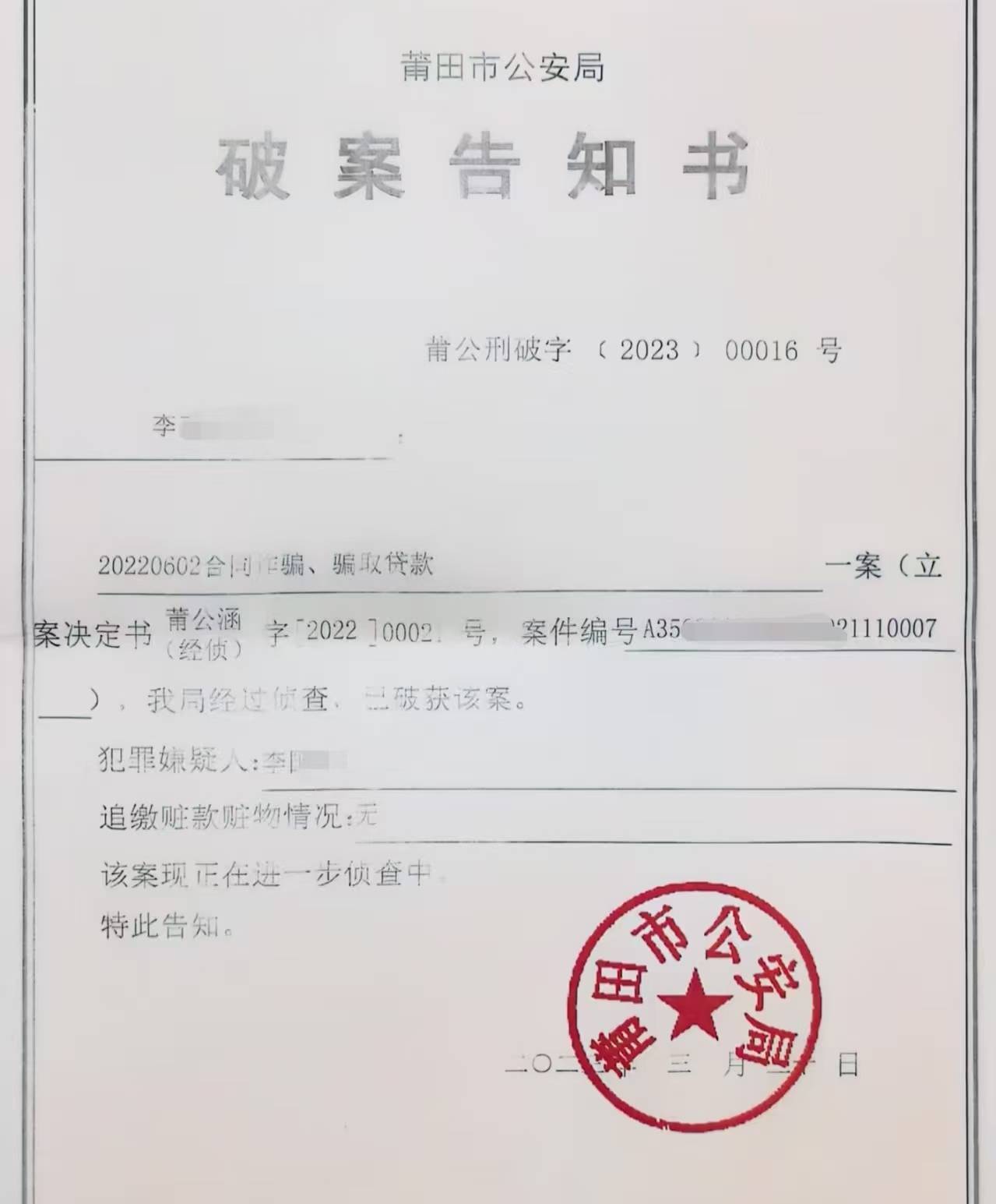2022年6月2日,李玉火报案。当年8月4日,警方出具立案告知书,以合同诈骗、骗取贷款案进行侦查。2023年3月20日,莆田市公安局宣布破案。